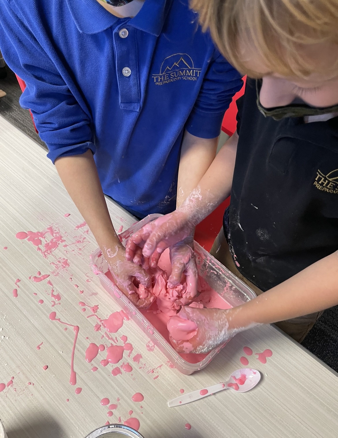 We discussed how Isaac Newton was the scientist who studied the states of matter, so when a material doesn’t fit his “rule”, it is called a non-Newtonian fluid. Of course, we had to see one in real life! We made “oobleck” out of corn starch and water. Oobleck is a non-Newtonian fluid because it becomes a solid when pressure is applied but is a liquid when there is no pressure on it. We had so much fun experimenting with the substance, trying out different consistencies, and getting MESSY!