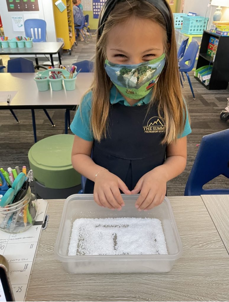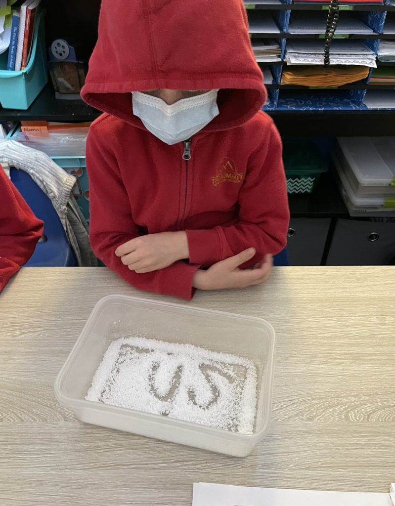 Today, first graders used multisensory learning to practice phonics at teacher table! We listened to a sound, spelled it with our finger in “instant snow” and then said the sound aloud. The instant snow was such a fun sensory experience and helped us practice the phonetic patterns that we have learned this year during our spelling program. We practiced vowels, blends, digraphs and the FLoSS Rule (this week’s spelling pattern).