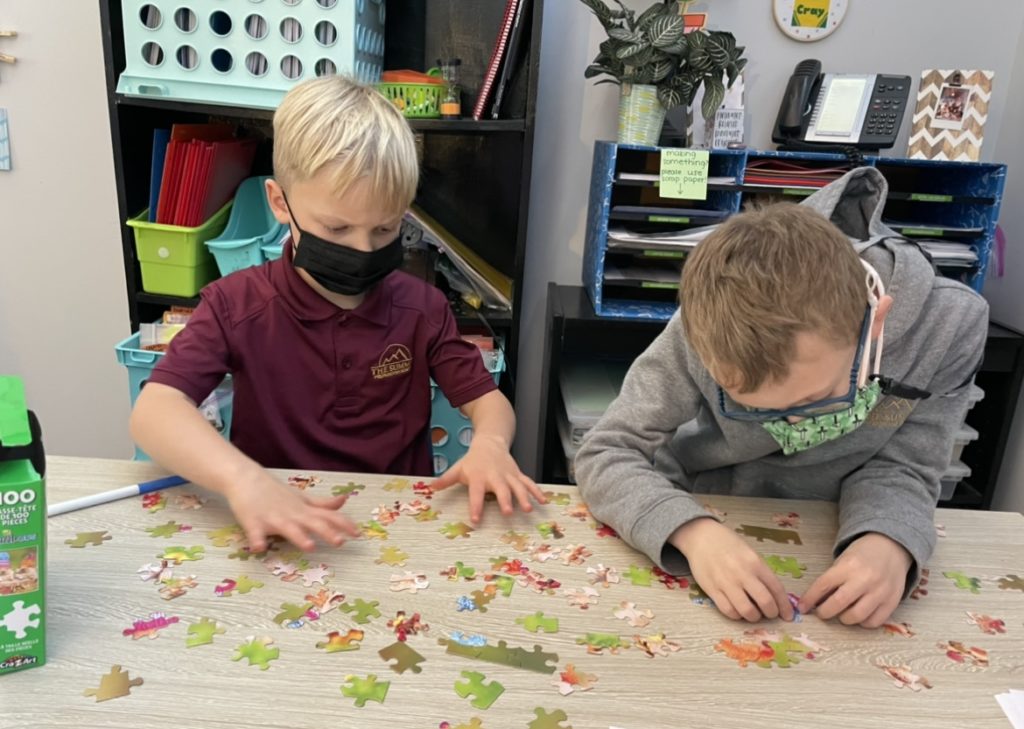Throughout the day, we continued our learning of the number 100 with a read aloud of Miss Mingo and the 100th Day of School by Jamie Harper, 100-piece puzzles, and creating a picture out of the number 100.