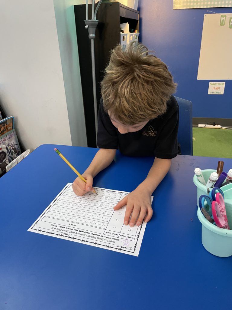 When printing with D’Nealian handwriting, lowercase letters c, o, a, d, g and q all begin with the same path of movement. Students practiced going “back and around” to begin their c shape, and then continuing with “up, down and curve” for a, d, g, and q. We also discussed how handwriting takes time and practice, so it’s important to make sure we set ourselves up for success. That means being focused and seated with a good pencil!