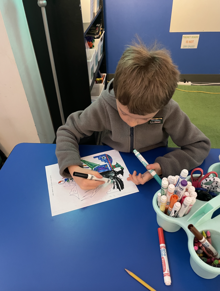 While reading we discussed the meaning of unknown words, made predictions and found text-to-world connections. After reading, we retold the story and discussed some reflection questions. We did some research as a class to see a close-up image of a crow’s feathers. Students discovered that the feathers look black from afar but really do have a rainbow shimmer in the right light! Finally, students colored a Native American image of a bird, drawn by a school-age child from the Acoma Pueblo tribe. Students colored the image of a two-sided bird to represent the two versions of the crow from the story: rainbow and black.