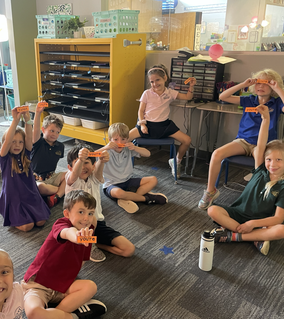 This afternoon, we practiced differentiating between your and you’re using a wide variety of examples. Students got two cards, one with each version of the word. Ms. Ursino read a sentence and we discussed which spelling we should use. Then students held up the correct form. When discussing, we thought about if “you are” fit in the sentence in place of your/you’re. For example “You are shirt is blue.” doesn’t make sense! If it did make sense, students held up the you’re card. If there was a noun associated with the word your/you’re, students thought “Does it belong to you?” and if the answer was yes, they held up your! After the first few sentences, first graders didn’t even need the whole-class discussion to help them, and they began independently identifying which version should be used! Check out some of our example sentences below and see if you can identify the correct version!