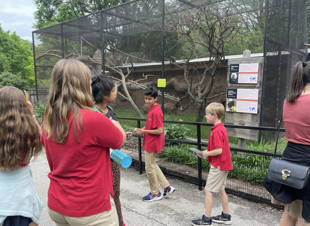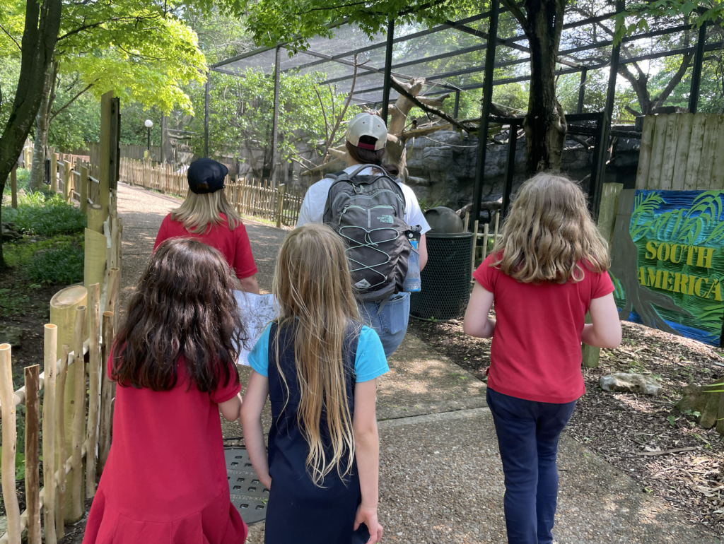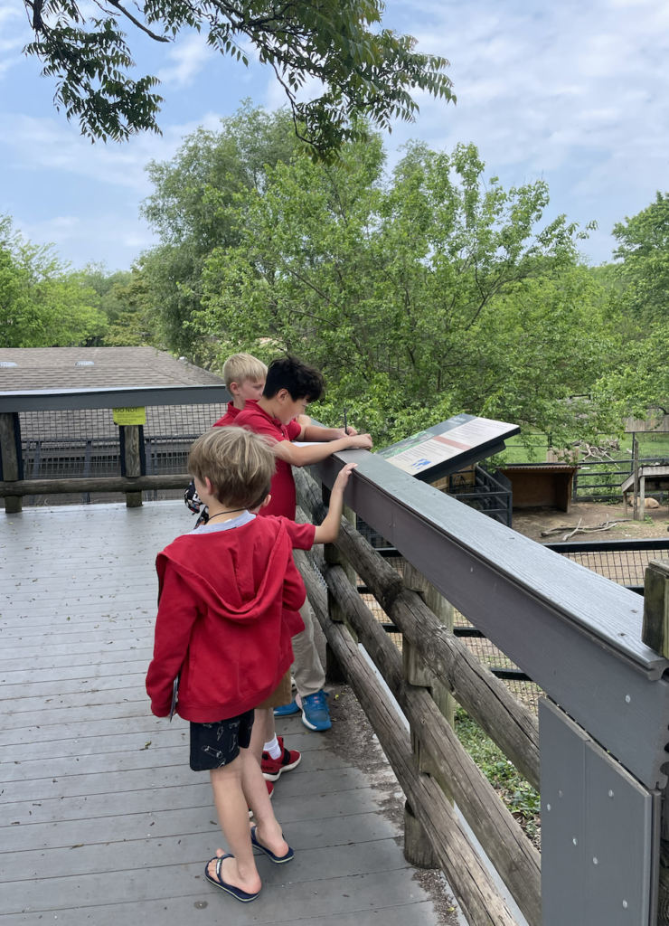 While exploring the zoo in small mixed-grade groups, the students worked together to fill out a scavenger hunt. They had to find animals that lived in certain habitats like grasslands or forests, that had certain physical characteristics like feathers or scales, and that had certain behaviors like being nocturnal or herbivorous.
