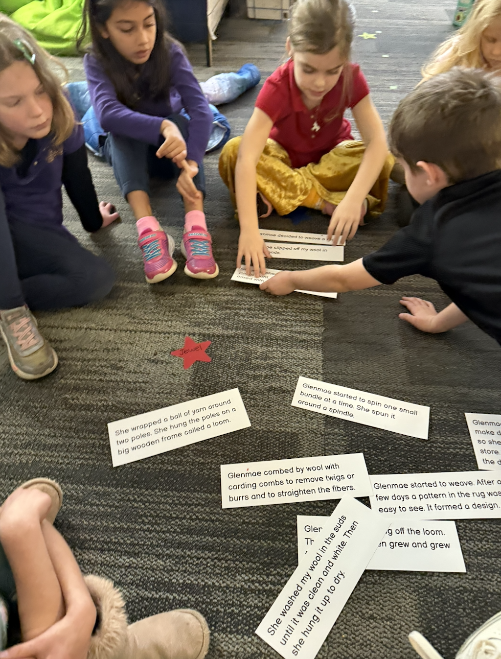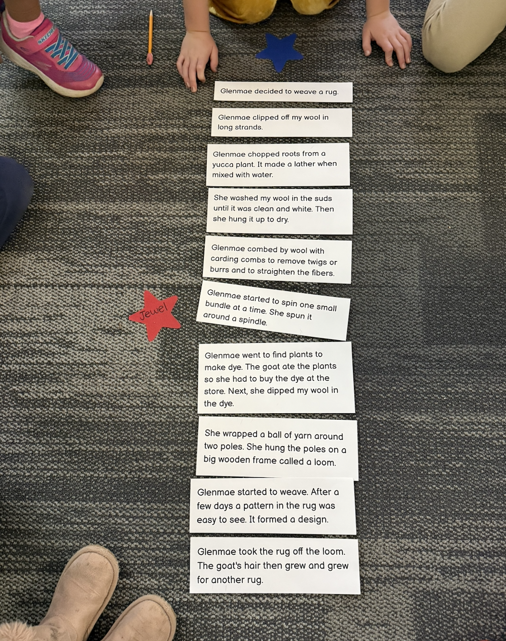 We began our exploration by reading , The Goat in the Rug. In the story, Geraldine, the goat, tells how Glenmae, a Navajo weaver creates a rug. First, Geraldine is clipped, and then her wool is spun into yarn. Carefully, the yarn is dyed, dried, and woven on a loom to make a beautiful rug. Students made connections to the story, noting the importance of natural resources. We paused throughout our story to learn about different aspects of the materials including seeing a sheep be sheared, looking at a yucca plants, and images of mohair. After reading, students practiced comprehension skills and cooperation by working together to sequence the steps taken to make the rug. Discussing components of Navajo rugs, specifically their bold colors and geometric designs, first grade students were eager to create their own rugs.