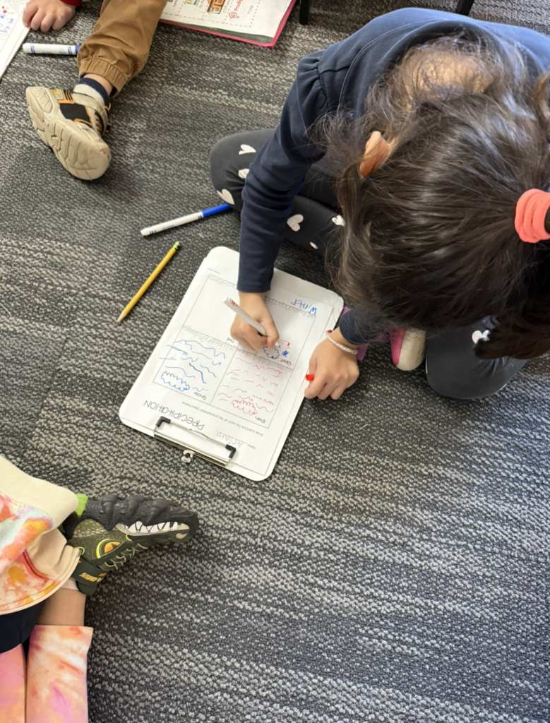 First graders helped Ms. Ursino make a big diagram of the formation of each of these types of precipitation on the dry erase board using a red marker to represent warm air or clouds and a blue marker to represent cold air or clouds. Then students each created their own diagram independently.