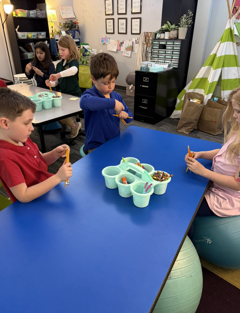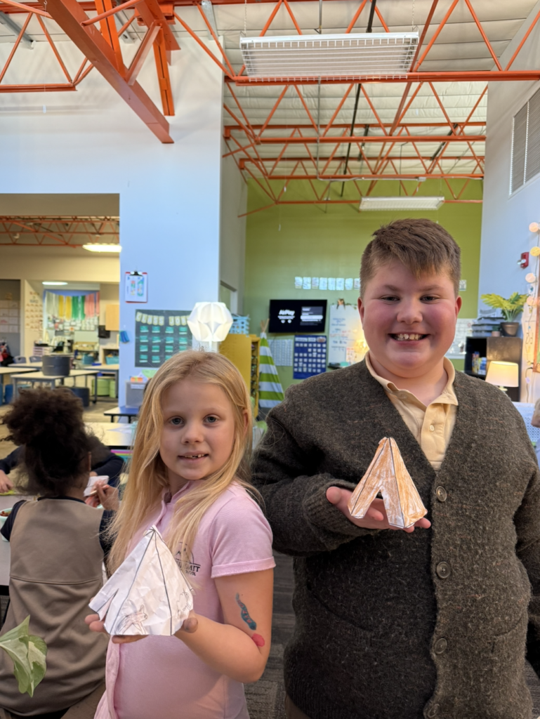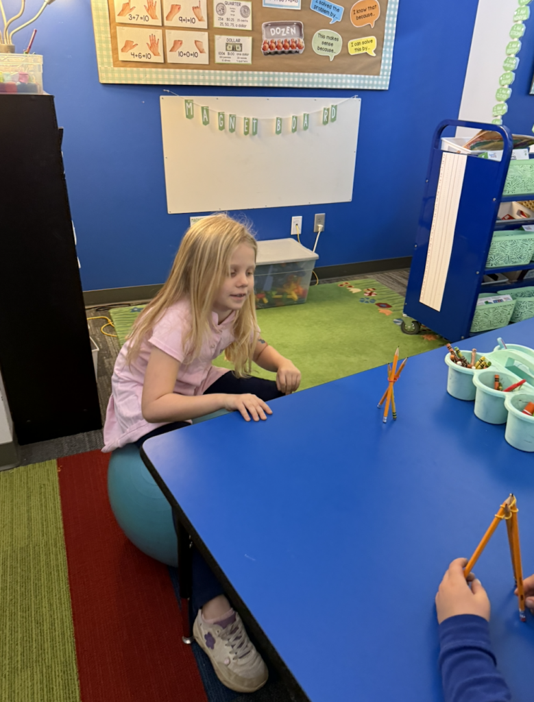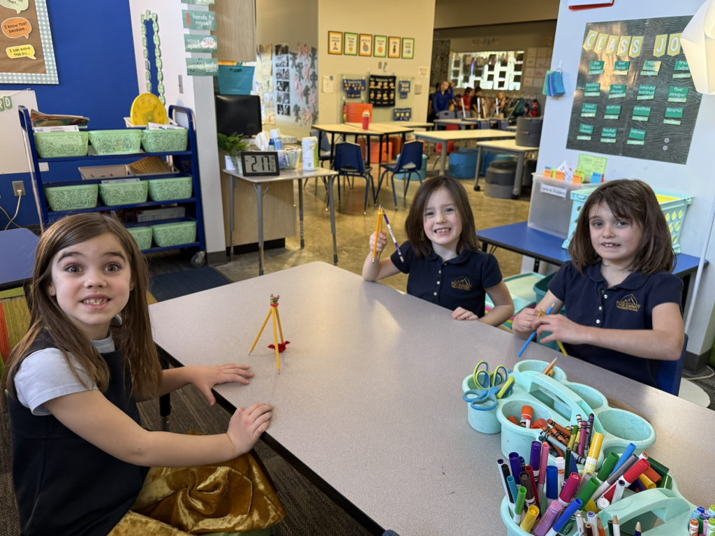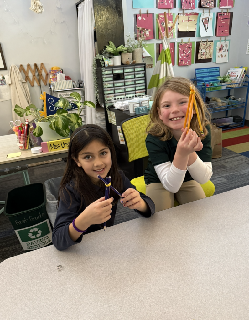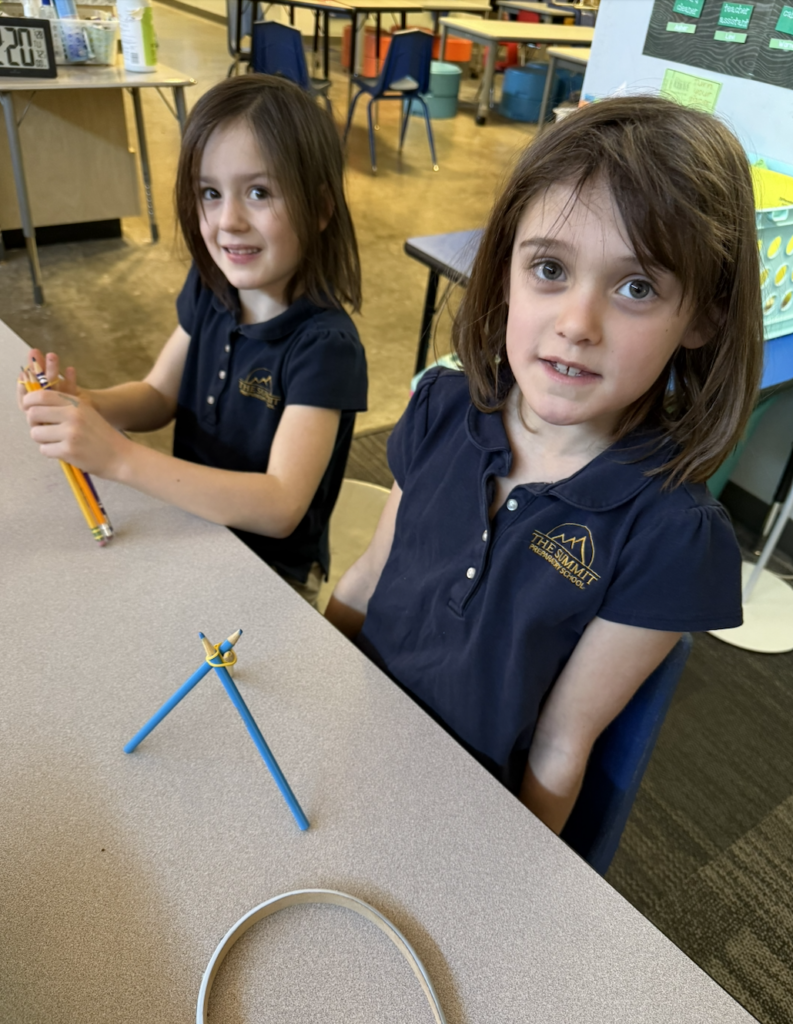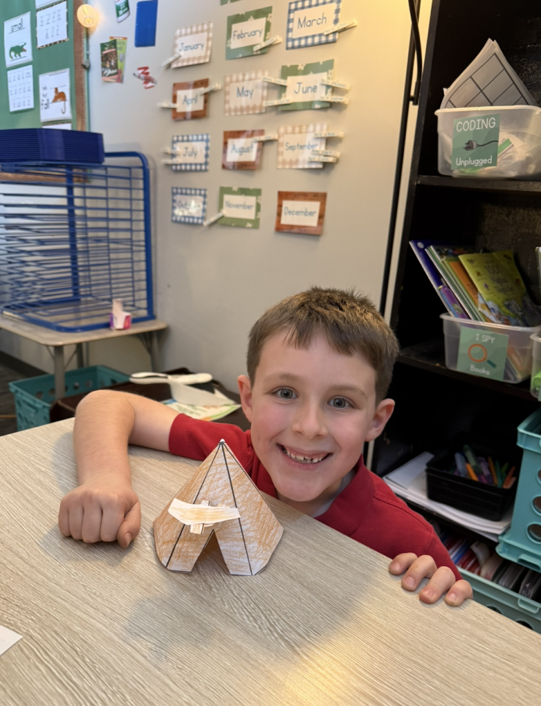 We have explored two types of shelters so far through hands-on creation. First, we explored teepees. First graders learned that tribes who lived in the Great Plains such as Lakota, Pawnee, Arapahoe, Kiowah, and Cheyenne used teepees as their shelters. They used animal hides or canvas stretched over wood. In class we investigated the structure and engineering of a teepee using photos of teepees, a video of a group of people building an authentic-style teepee, and our very own classroom tents that are formed like teepees. We discovered they were created from material in the shape of a half circle, so that when it is wrapped around the wood it forms a cone shape. Another essential part of the structure is the foundation built from poles and string. We investigated the way that our classroom tent is strongest when the poles were spaced further apart at the bottom and closer at the top. We also looked at the function of the rope at the top. We discovered that the rope served two jobs: holding up the canvas and keeping the poles in the right formation. Then, first graders headed off to investigate the best way to build the structure of a teepee. Using pencils and rubber bands, students worked in groups or alone to construct the materials into a teepee structure that was strong and sturdy. For some it took a few tries, but they all were able to create the structure!