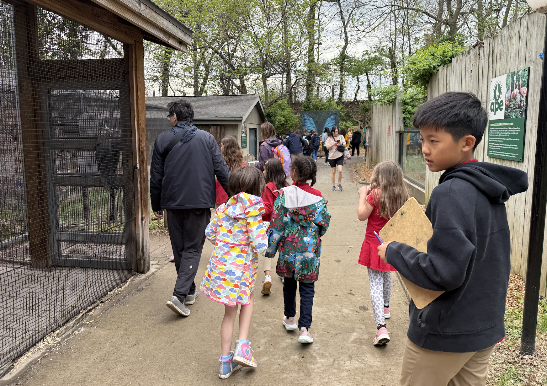 While exploring the zoo in small mixed-grade groups, the students worked together to fill out a scavenger hunt for first grade and a research planning sheet for fifth grade. They had to find animals that lived in certain habitats like grasslands or forests, that had certain physical characteristics like feathers or scales, and that had certain behaviors like being nocturnal or herbivorous. The students had so much fun exploring the zoo with their older and younger peers!
