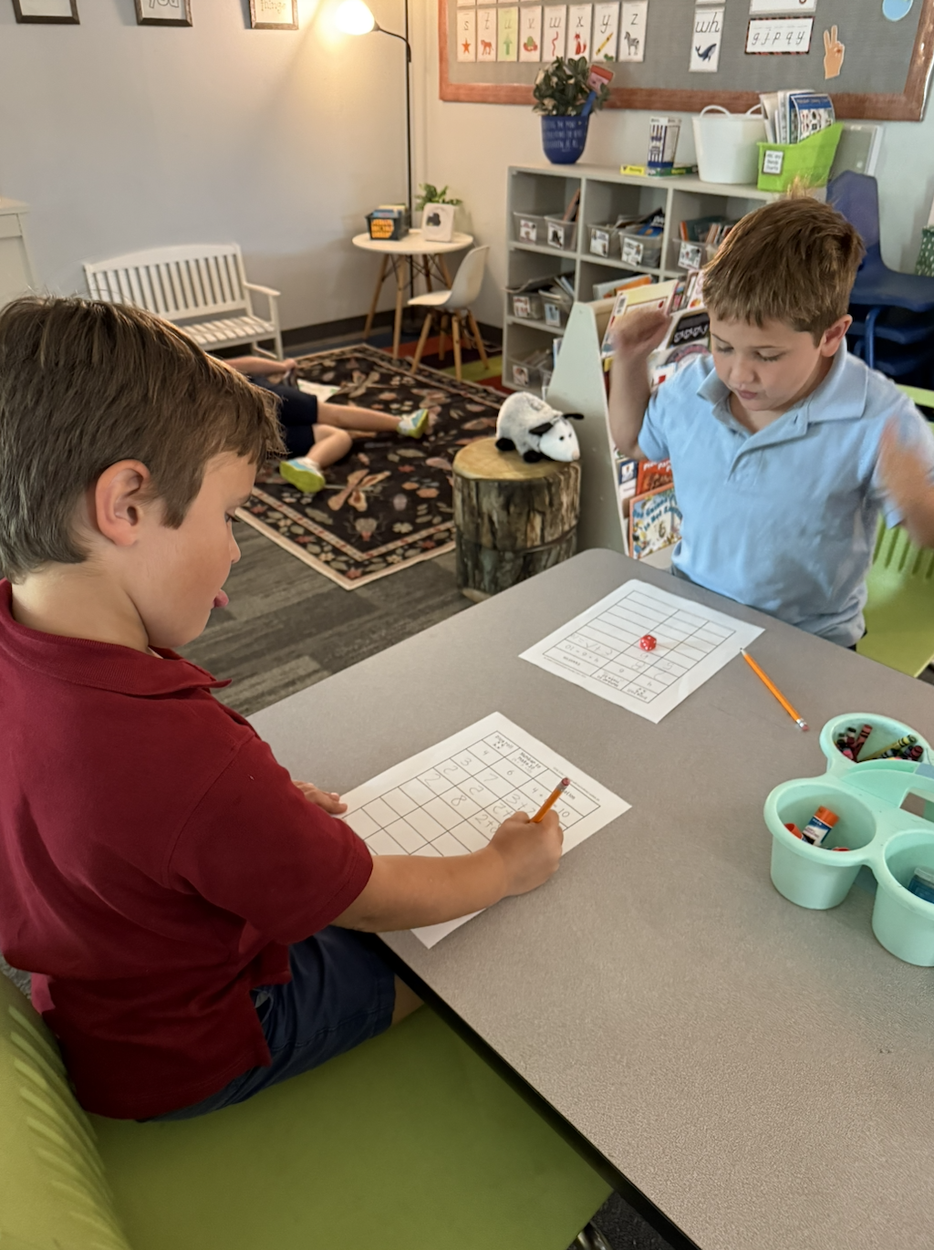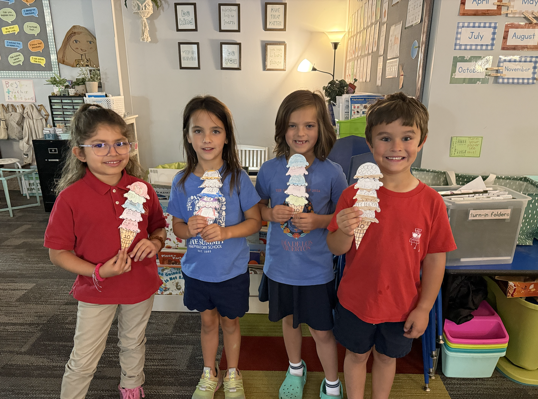 To practice representing tens with a variety of methods, first graders have been creating some art projects to display! On Tuesday, we created hamburgers with a ten on each ingredient, focusing on using addition sentences. After finishing their hamburger project, they got to do something special – get the computers out to listen to some songs about making tens! On Thursday, we created ice cream cones using some addition sentences along with other ways to show ten such as ten frames, tallies, fingers and subtraction sentences on each scoop! First graders have also been exploring 10s during their stations, working with partners for a dice game and using a special tool (highlighters!) to search for pairs to make ten.