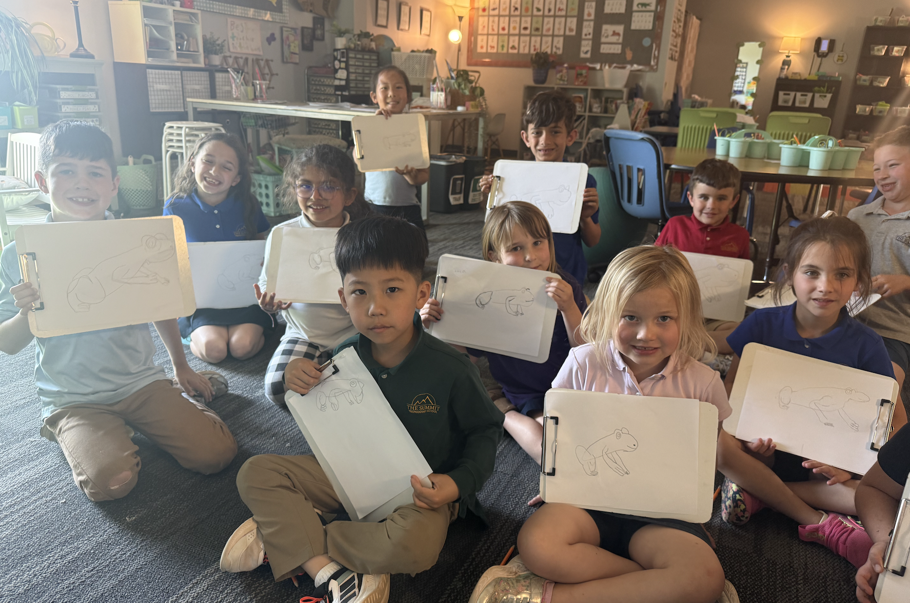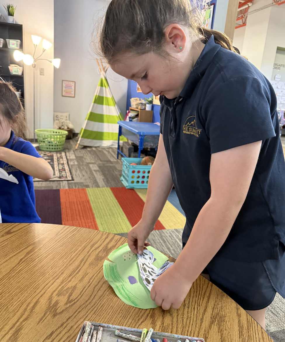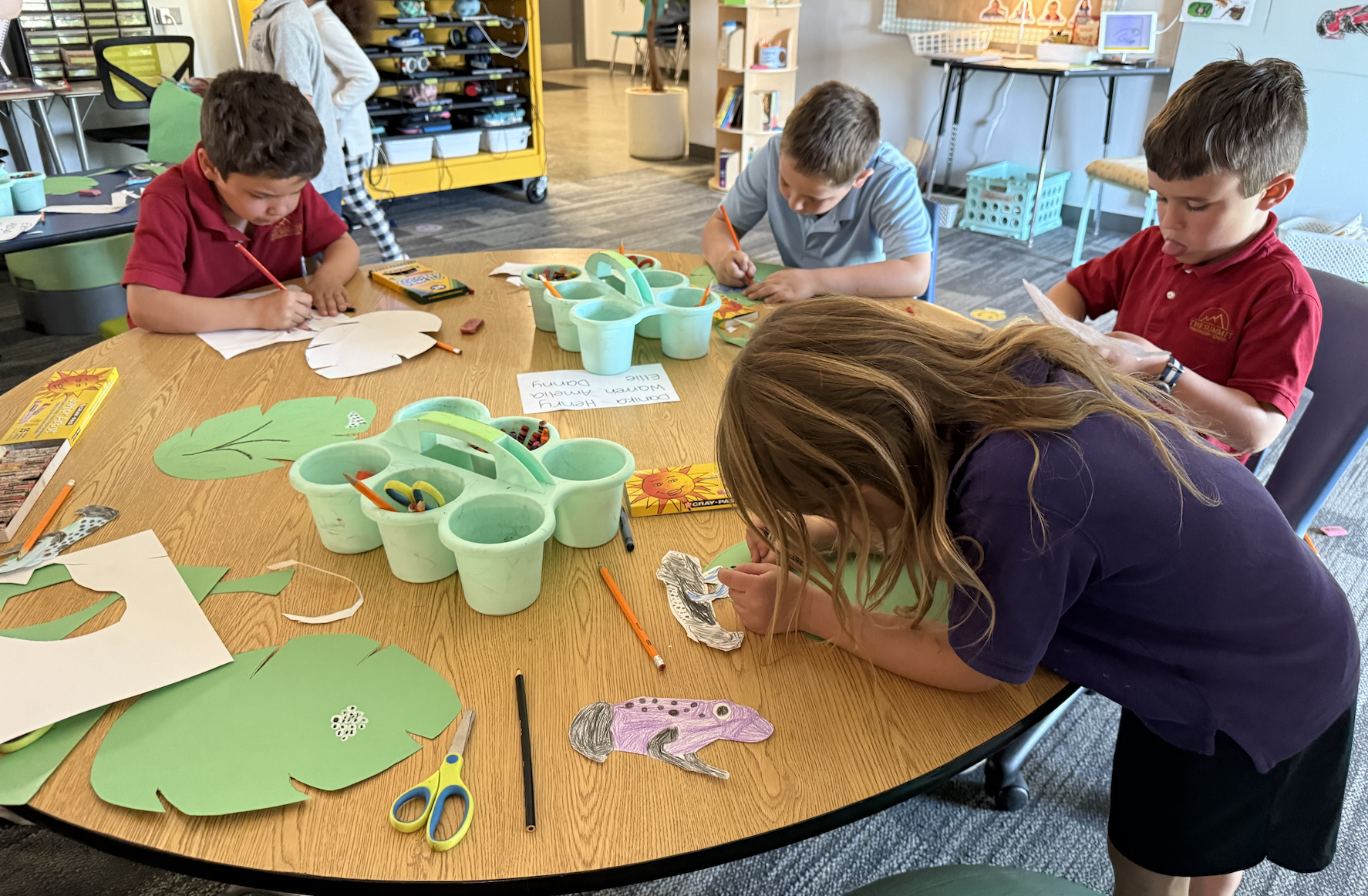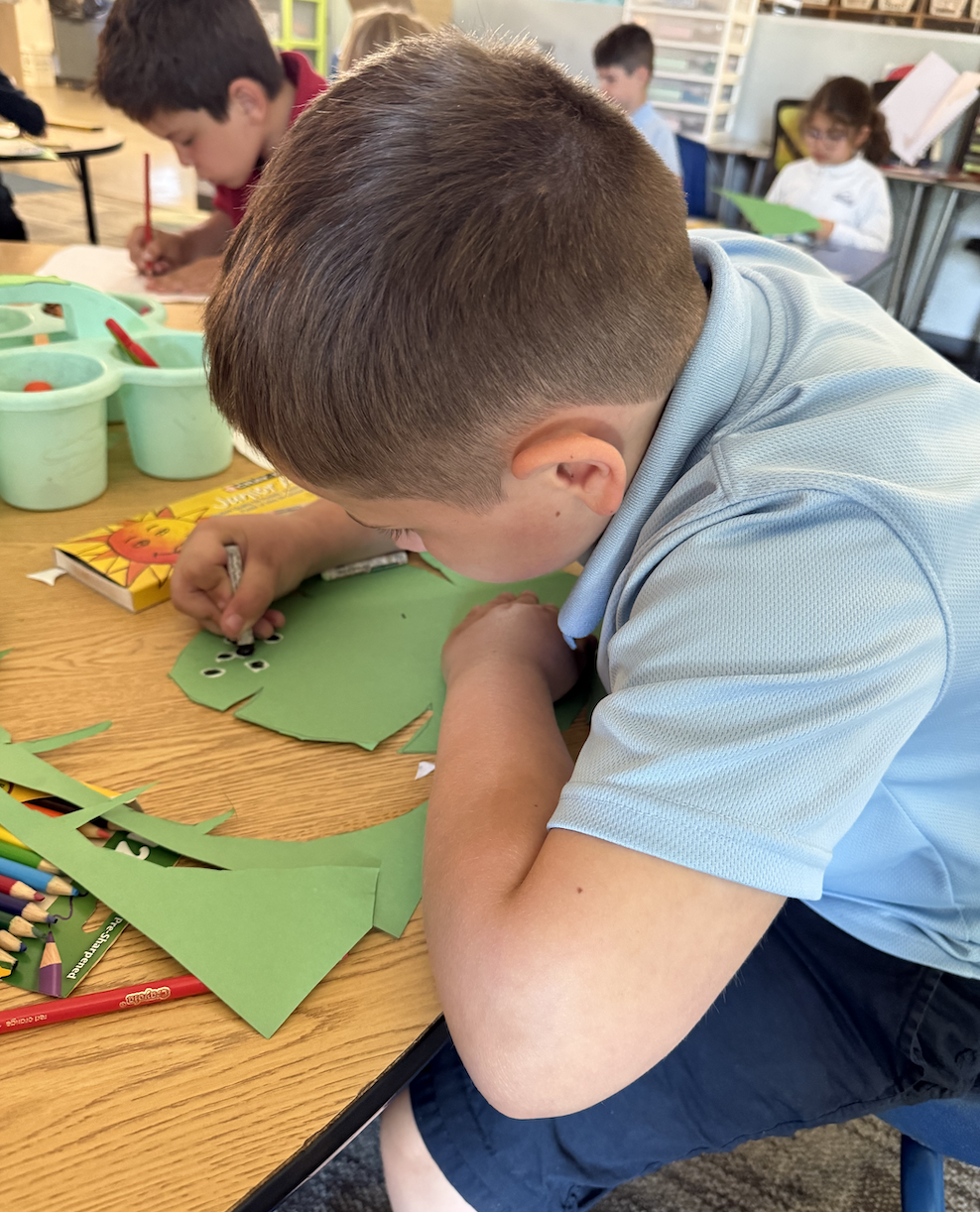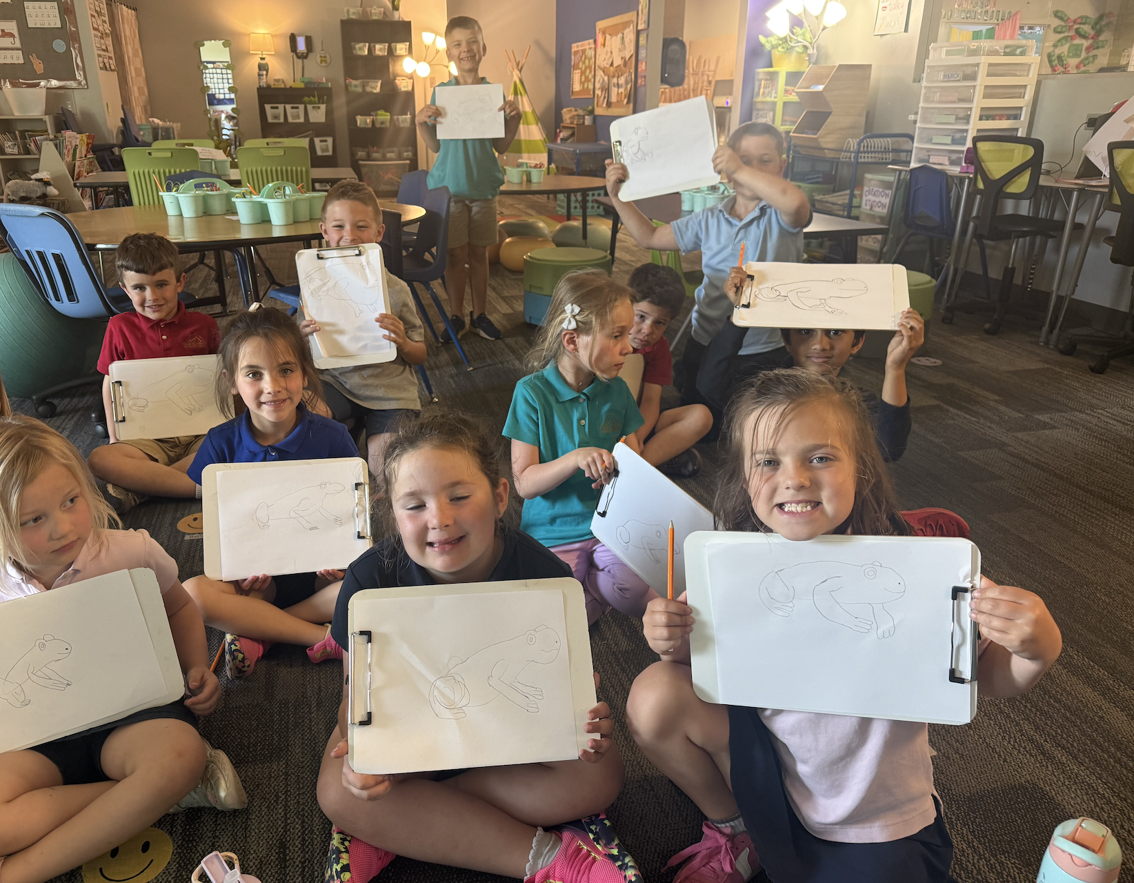 We created an art project of a poison dart frog by starting with a whole group directed drawing. Directed drawings are great for practicing direction following and fine motor skills. Next, students colored their drawn frog with a color pattern typical of a poison dart frog – black with bright color spots or blobs! Finally, they created a leaf for their frog to lay its eggs on just as it would in the rainforest. We viewed images of poison dart frog eggs on leaves and noted that they look clear with a black circle in the middle. The black circle is the first stage of what will later become a tadpole! First graders used oil pastels to add 5-40 frog eggs to their leaf, as this is the range of eggs that poison dart frogs typically lay at one time.