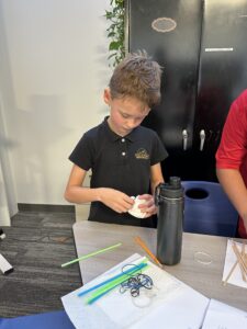 Students created an ‘egg drop protection device’ in hopes they could prevent an egg from breaking when dropped. They made predictions, asked questions, formulated a design, tested their hypothesis, and modified their design based on the results.