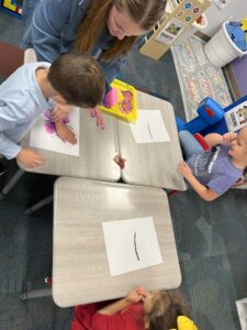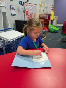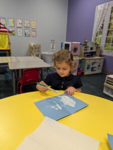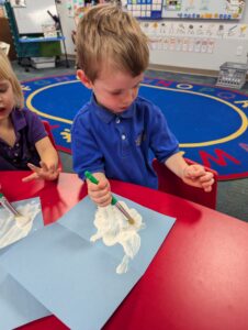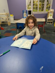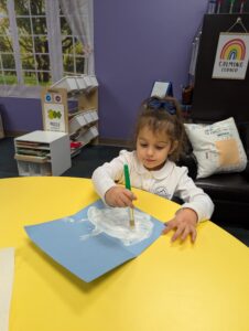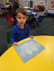 We’ve observed and discussed clouds when learning about weather last month, but brought them back into the conversation this week to emphasize things that start with C! Students painted part of a piece of paper, and then folded it in half to transfer and reveal a unique painting of the sky.