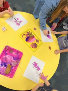 Today we talked about caterpillars and how they eventually turn into beautiful butterflies. We used nature to help us with our next creation. Students used sticks for the butterfly body and pressed painted leaves onto their paper to create the wings. It was messy, but so fun.