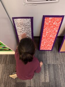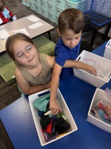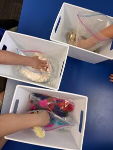 We started with the sense of sight, where each student identified something visible in the classroom. During stations, students completed a “finish the image” worksheet, in which they continued drawing to match an existing image on one side. Next, we focused on hearing, listening to different sounds and drawing what they heard. Afterwards, students shared their interpretations of the sounds. Moving on to touch, they explored various textures by placing their hands in different bins to feel soft, smooth, rough, and other textures.
