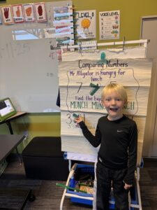 Kindergarteners have recently been learning how to compare numbers. In our classroom, we use the “alligator method” to help teach this concept. It’s a fun and visual way for students to understand the idea of “more” and “less.” For this method, we visualize an alligator with its mouth open, eager to eat the larger number. The alligator’s mouth always faces the larger number, reinforcing the idea that “greater than” is represented by the open side of the alligator’s mouth. This approach not only helps students grasp the greater than (>) and less than (<) symbols, but it also makes learning more engaging by adding a playful elem