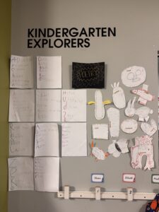 During writing time, kindergarteners have been exploring the concept of poems. Poetry in kindergarten goes beyond a mere creative exercise; it serves as an engaging method to develop literacy skills and nurture imagination. At this early stage, young learners are introduced to the rhythm, rhyme, and sounds of language, while shape poems offer a fun, visual way to bring these concepts to life. Students have created shape poems in which words are arranged to create a picture that symbolizes the subject of the poem. For instance, a poem about a tree would be shaped like a tree, or a poem about a banana would take the form of a banana itself. This style of poetry not only fosters creativity but also helps young children comprehend that words and language can possess both meaning and form. Additionally, students created name poems where they had to come up with a specific word or sentence that might describe themselves using the letters in their own name. Such as: